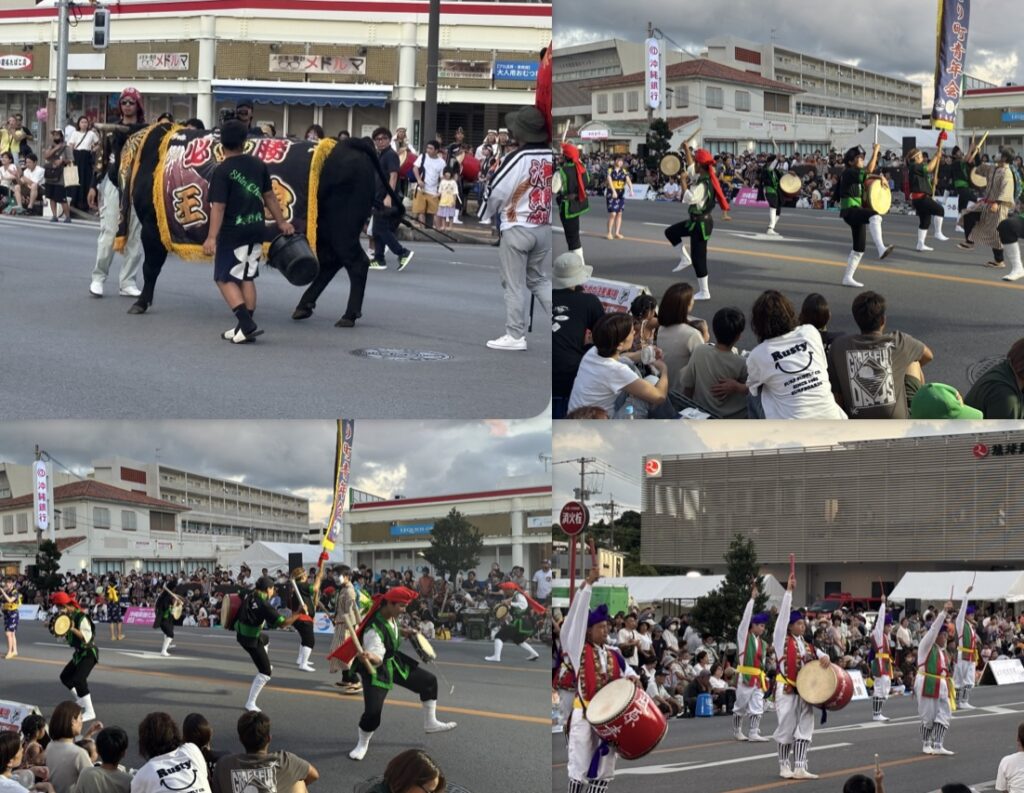 第20回を迎えたうるま市エイサーまつり。うるま市施行20周年の節目となる今年は、姉妹都市からもパレードが参加し、横綱闘牛の行列も加わった。太鼓の音が宵の空気を揺らし、通りが一つの舞台に変わる。普段は車の往来が絶えない安慶名交差点、県道75号もこの日ばかりは太鼓と掛け声が響き合い、街全体が祭りのリズムに包まれる。市内各地区の青年会が次々と演舞を披露し、観客の拍手と歓声が波のように広がる。