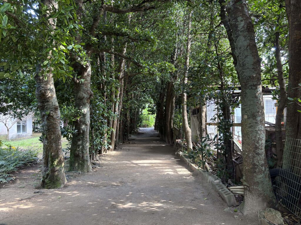本部町備瀬の集落を抜ける道。両側に立つフクギが風を受け、影を落とす。家々の壁に葉が触れ、光を散らしていた。観光の道ではない。ここでは、人と木が当たり前のように寄り添っている。静けさが深く、言葉を置く場所もない。潮の匂いがかすかに届き、遠くで子どもの声がした。この風景も、少しずつ変わっていくのだろうか。
