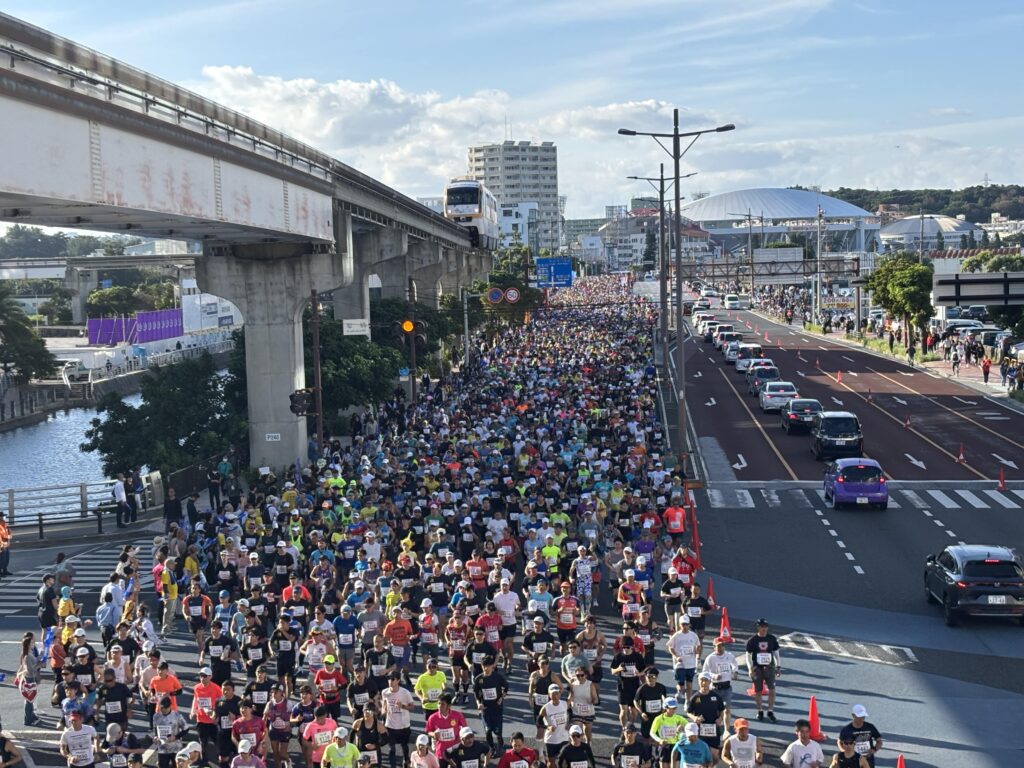 ゆいレールの高架下を埋め尽くすランナーの列を眺めていると、年の瀬の空気がふっと広がる。NAHAマラソンは、走るだけの大会ではなく、年末の風物詩として定着した“一年締めくくりのお祭り”。絶え間ない沿道の応援と、それを受けて走るランナーたち。そして清々しい朝の光。眺めても、走っても、そこにはそれぞれのNAHAマラソンがある。