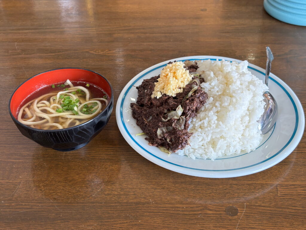 この日の昼食は、久しぶりに復活した金武町久松食堂のチーイリチー定食。しかもアグー豚のチーイリチー。刻みニンニクが添えられ、見た目からして覚悟が要る。一口食べると、豚の旨みと血のコクが重なり合う。白ごはんは、あくまで受け止め役だ。セットの沖縄そばは、濃厚なチーイリチーの合間に口にすると、ちょうどいいリセットになる。観光客向けではない、地元の日常に溶け込んだ沖縄の定食だ。
