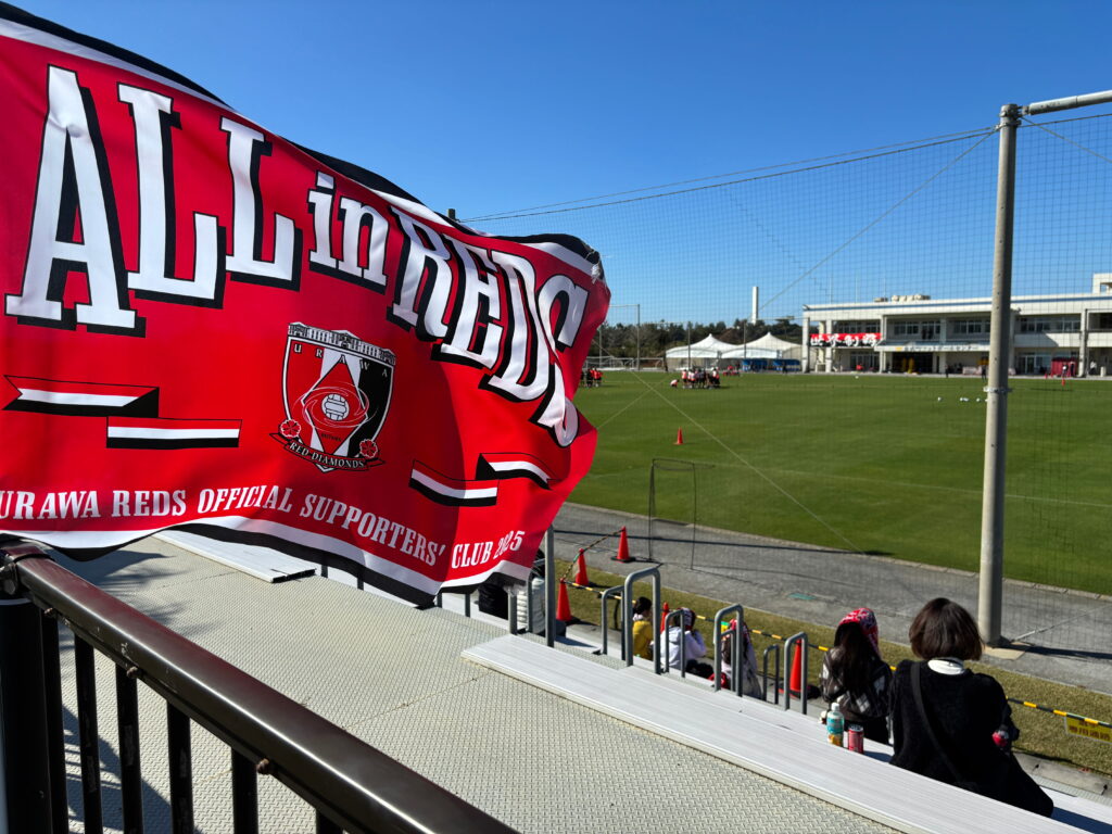 ポカポカ陽気の日和のキャンプ日和にサッカーキャンプを見に行ってきた。この日の天気は文句なしの晴天。青空の下ピッチでは浦和レッズの選手たちが、シーズンに向けて集中した表情でトレーニングに取り組んでいた。スタンドにはサポーターの姿も多く、赤いフラッグが青空によく映えている。南国らしい穏やかな空気の中で、チームとサポーターが一体となる、沖縄キャンプならではの光景だ。