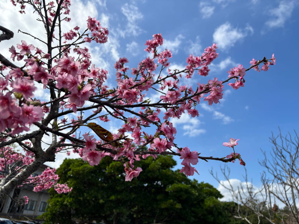 澄んだ青空に、寒緋桜の濃いピンクがよく映える。沖縄の桜は、やはりこの色とこの佇まいがいちばんしっくりくる。本部町八重岳では、現在 3~4分咲き。山全体が一気に華やぐには、もう少し時間がかかりそうだが、その分、一本一本の木の表情をゆっくり楽しめる時期でもある。派手に主張するわけではないけれど、確実に季節の流れを教えてくれるのが寒緋桜だ。今年の八重岳も、少しずつ、確実に春へ向かっている。